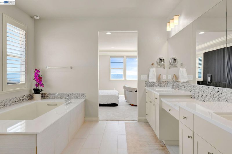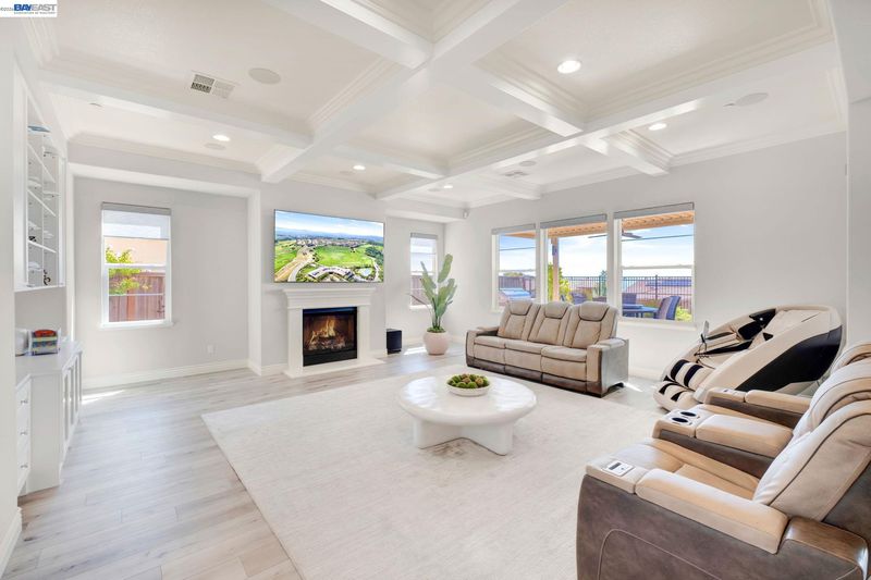 Exquisite home in prestigious Stonebrae Golf Club community, one of the most idyllic East Bay locations with spectacular views from San Francisco to South Bay. This luxury residence offers 5 bedrooms plus office, bonus room and 4.5 bathrooms, including a primary suite downstairs. The home boasts coffered ceilings, crown molding, and wainscoting. The formal dining room provides the ideal space for memorable dinners, while the open-concept kitchen and family room are ideal for gatherings. The gourmet kitchen is equipped with high-end appliances, a walk-in pantry, and a center island. A fully collapsible sliding door connects the kitchen to the outdoor California room with fireplace and STUNNING BAY VIEWS. Upstairs, the expansive master suite offers a private balcony that provides breathtaking vistas and features an expansive walk-in closet, dual vanities, oversized tub, and a sit-down vanity area. Additional highlights include hardwood flooring, upgraded sound system in the great room, and laundry room with cabinets and a sink. The private backyard offers a covered patio with built-in BBQ, stamped concrete walkway, a putting green & a bocce court. The guarded community has 24-hour security and optional country club memberships with access to a gym, golf, tennis courts and pool.